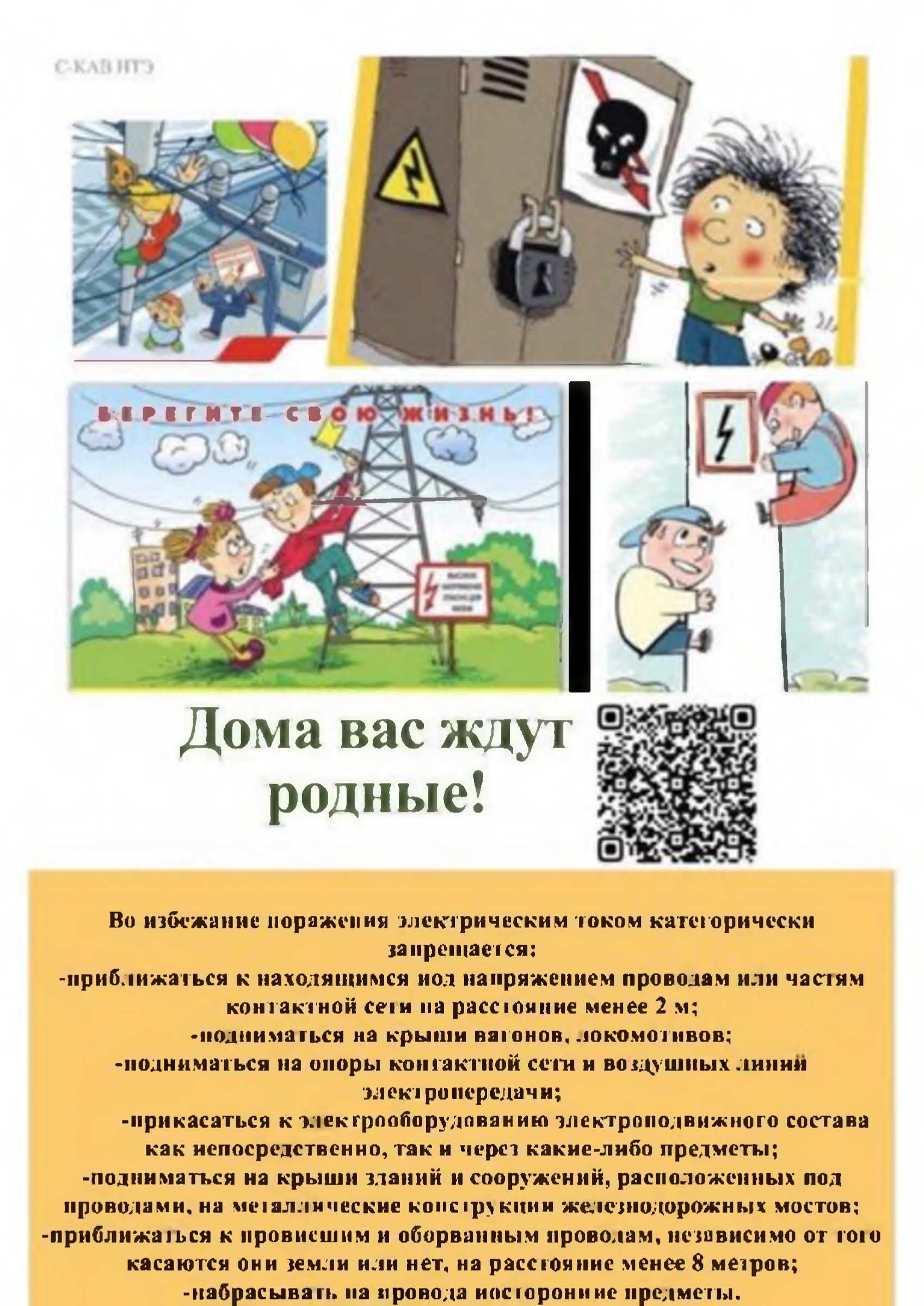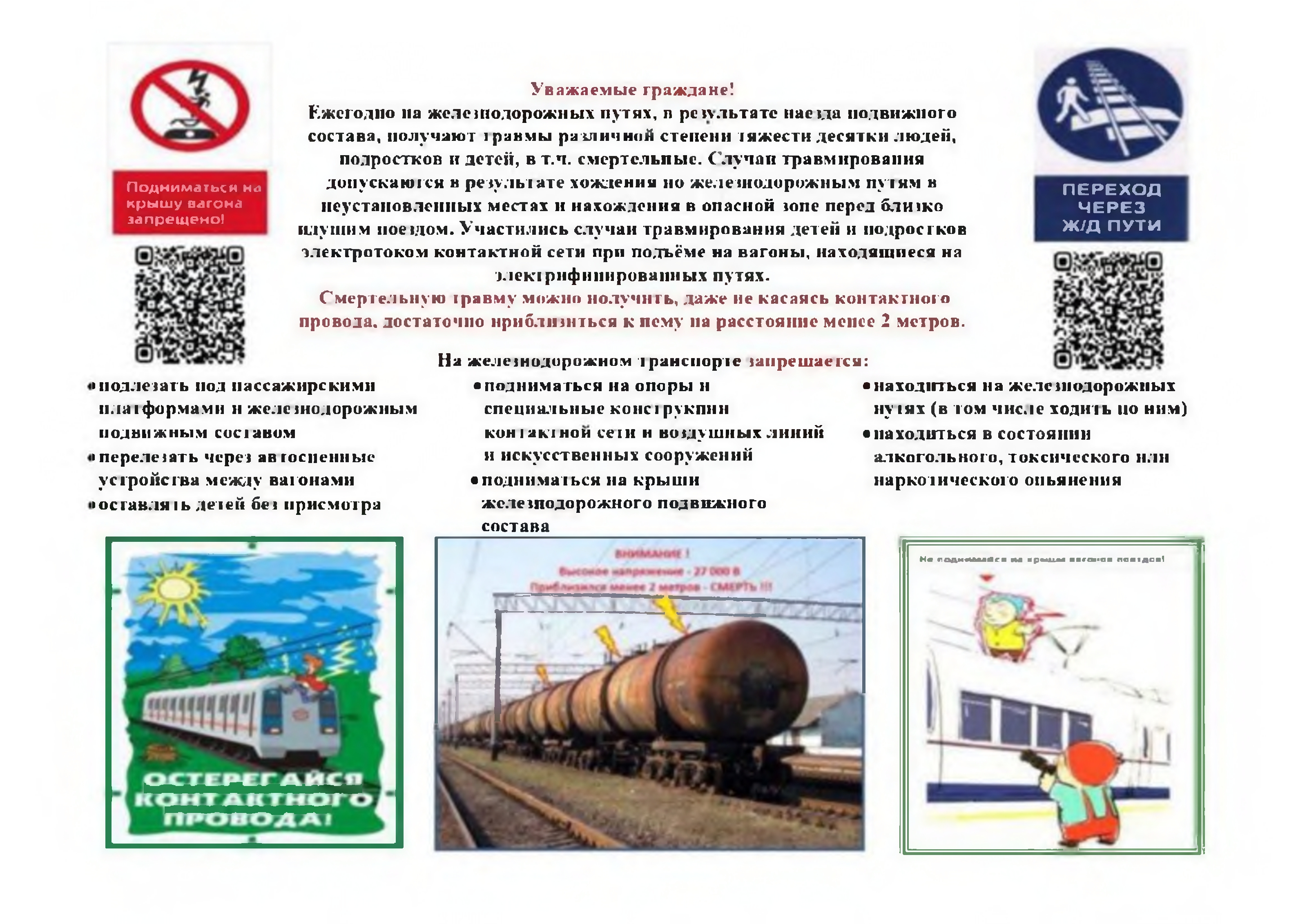 - не поднимайтесь на крыш и вагонов поездов, опорыи специальные конструкции контактной сети, воздушныхлиний и искусственных сооружений, ведь напряжениев проводах достигает 27500 Вольт!