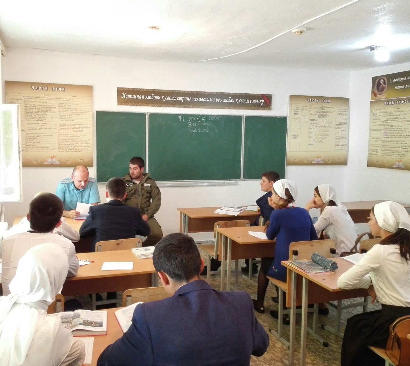 В целях обеспечения пожарной безопасности в школе ежемесячно проводятся беседы о ЧС и как нужно вести себя в таких случаях. 2 октября был проведен открытый урок совместно с сотрудниками МЧС и ПС.